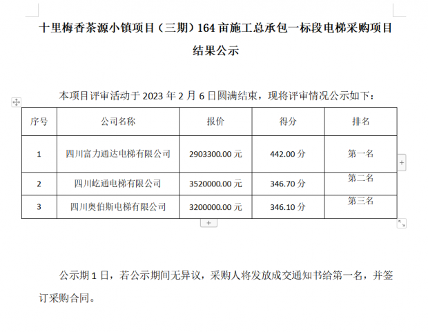 十里梅香茶源小鎮(zhèn)項目(三期)164畝施工總承包一標(biāo)段電梯采購項目 結(jié)果公示